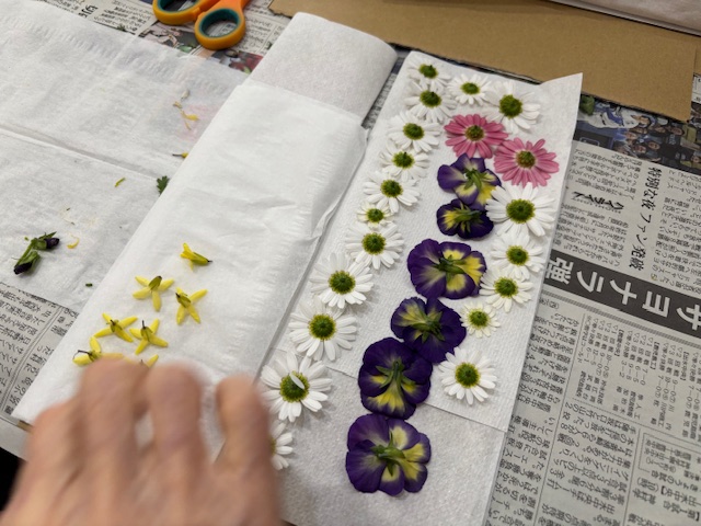 そうする事で、花の中にある水分を抜いてカラカラの状態になり、キレイな押し花が出来上がるんですよ~
