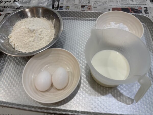 生地の材料が、卵、砂糖、牛乳、ホットケーキミックスになります!