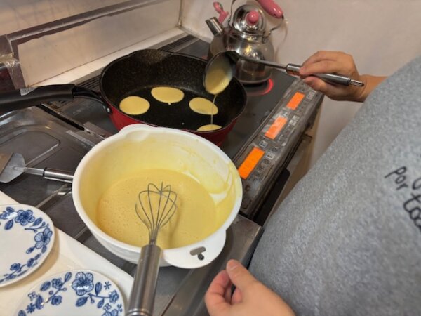 卵や砂糖などかき混ぜて生地を作り、ホットプレートで焼いていきます‼