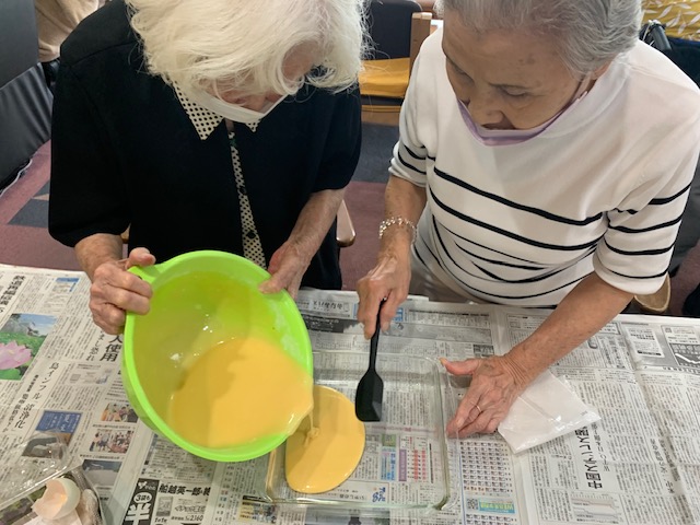 女性ご利用者様2名と男性スタッフ1名でどんな、オヤツが出来上がるでしょうか⁉