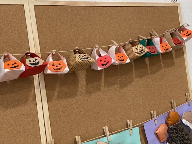 ではなく、お菓子を入れて配る用のカワイイ箱作りを行いました♪