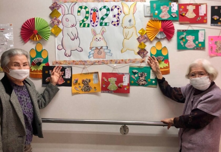 壁紙の完成に向け、作った物をさっそく飾り付けていきます。まず最初に以前のブログでもご紹介した利用者の皆様が個人で作成したお正月タペストリーをぶら下げていきます。
