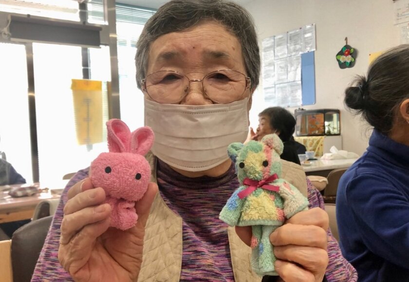 なんと、利用者の皆様がそれぞれご自宅で使っていないハンドタオルを持って来ていただき、それを活用して作った可愛いクマさんやウサギさんの人形です。