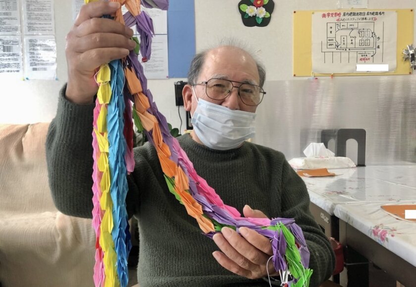 あるご利用者様がご自宅でコツコツ折っていたという大量の折り鶴を持って来てくださいました。しかも赤や黄色にオレンジ、ピンクに水色、緑色など様々な色の折り鶴があり、これには同席のご利用者様やスタッフもビックリ仰天!これはもう繋げて千羽鶴にするしかない!という事で、さっそく作業が開始されました。