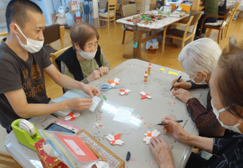 こちらでは別の壁紙に必要な物を作成中(●´ω`●)折り紙でトンボを作っているようです(/・ω・)/今からの時期にトンボが飛び回って季節を教えてくれるかのように周りを飛んでくれることがありますからね(*^▽^*)こちらもどんなものが出来るのでしょうか(^o^)/