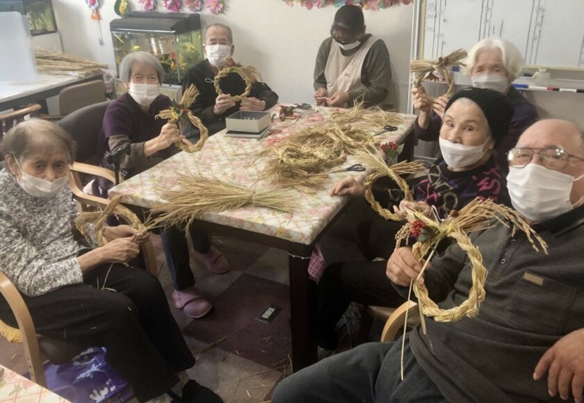 一方、デイサービスではご利用者様とスタッフが一足早く、しめ縄作りの制作に取り掛かっていました。