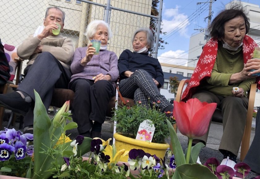 陽射しの暖かさの中、みんな揃って青空の下、お花を見たりおしゃべりをして楽しまれる皆様のお顔には自然と笑顔が溢れ出ていました。そして皆で一緒にピースして記念撮影!とってもいい写真が撮れました。