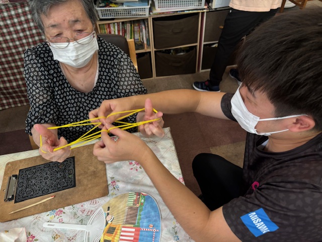 早速、ご利用者様と男性スタッフが一緒にあやとりを楽しまれていました☆彡