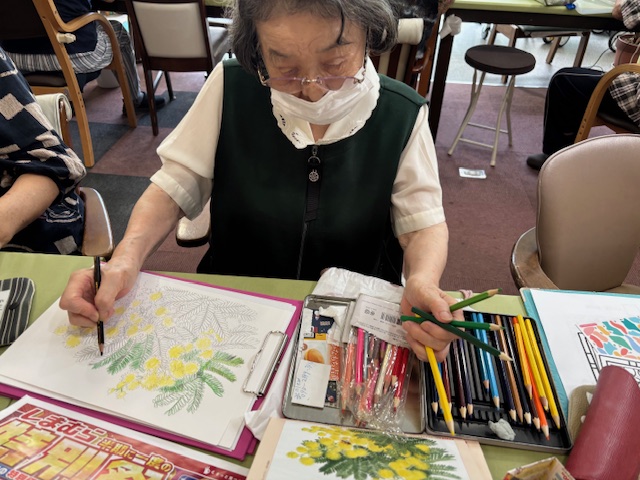 色鉛筆を手に、花の塗り絵に挑戦されている女性ご利用者様☆彡