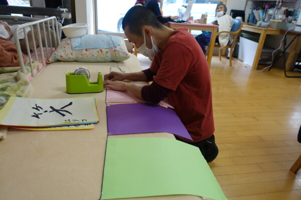 習字は画用紙に貼り付けて、直接習字紙にセロハンテープを貼らなくてもよい様にしています。