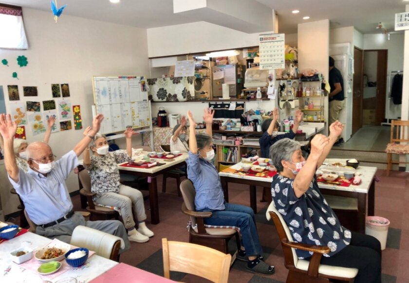 今日のおやつは冷やした黄桃ケーキ、マッシュスイートポテト、冷やしバナナ。飲み物は先日から漬けておいた梅シロップを使って作った冷えた梅ジュースです。ちょっぴり豪華なおやつの登場に利用者の皆様も暑さを忘れて目を輝かせ、下記の写真のように美味しそうに召し上がっておられました。