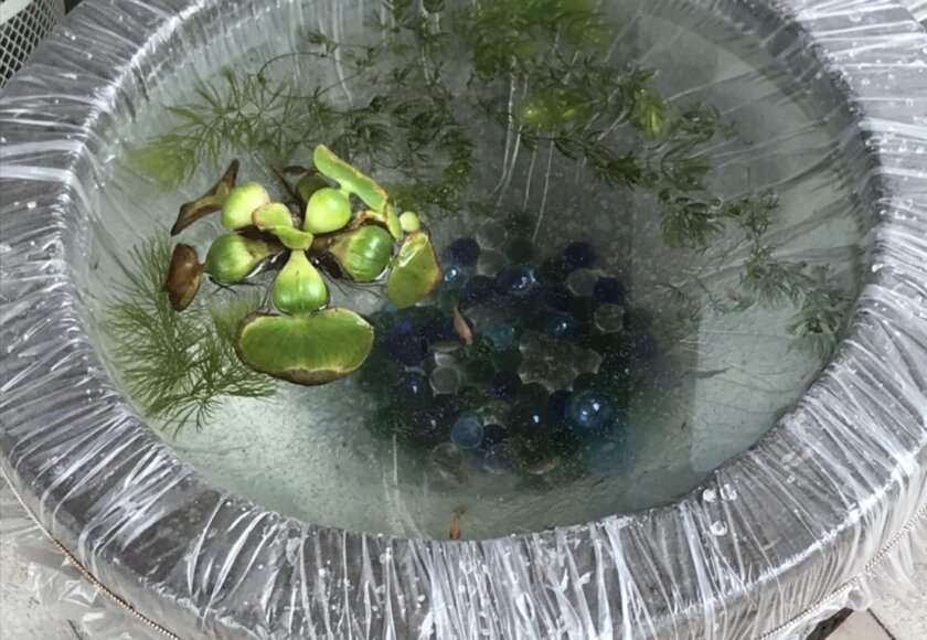 ご利用者様にいつでも観察して頂ける様に室内は勿論、玄関入口にも「臼」を再利用した金魚鉢を作成しました。