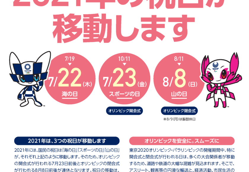 皆様!本年2021祝日が移動しているのはご存じですよね?