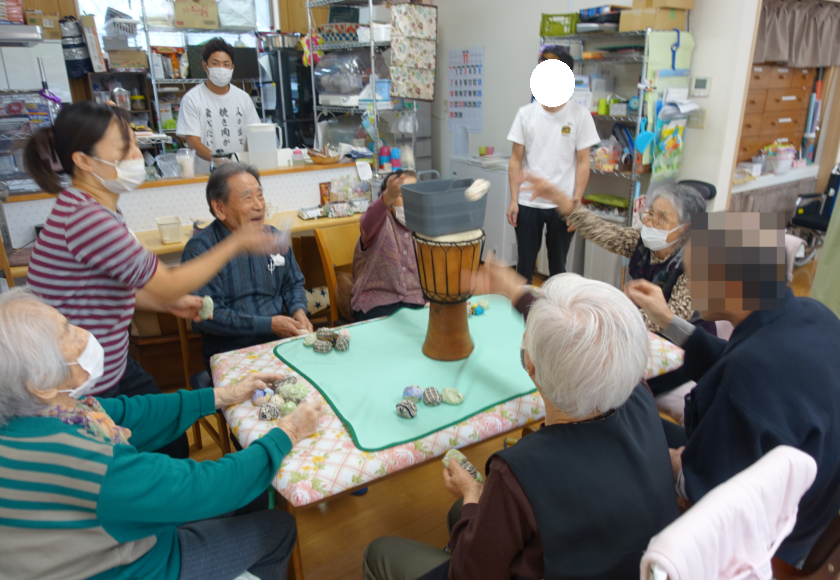 いざ本番へ♪ご利用者様籠に向かって一斉にお手玉を投げて投げて投げて!!お手玉があっちらこっちら色んな所へと飛んでいきました(笑)