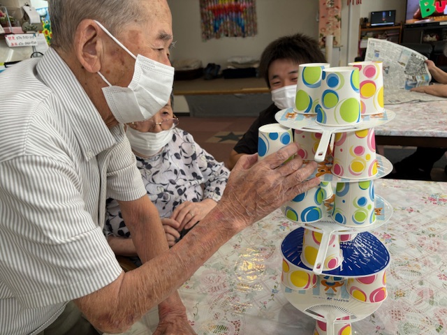 と言う大きな声が響きながらも、ご利用者様は笑顔で崩れた紙コップと団扇を再度、組み立てていました♪