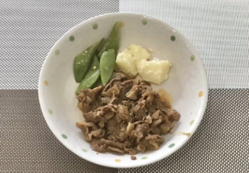 牛肉もキャベツも高騰しておりますがタップリ使用し 小鉢はポテトサラダ たまごスープ 白桃ゼリー