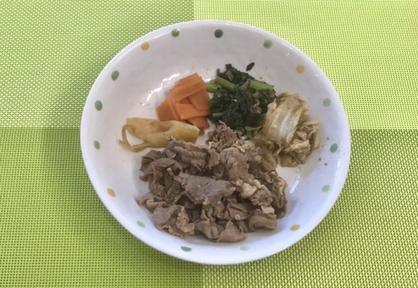 小鉢は、キャベツのペペロンチーノ風 わかめと玉葱のコンソメスープ 白桃ゼリー