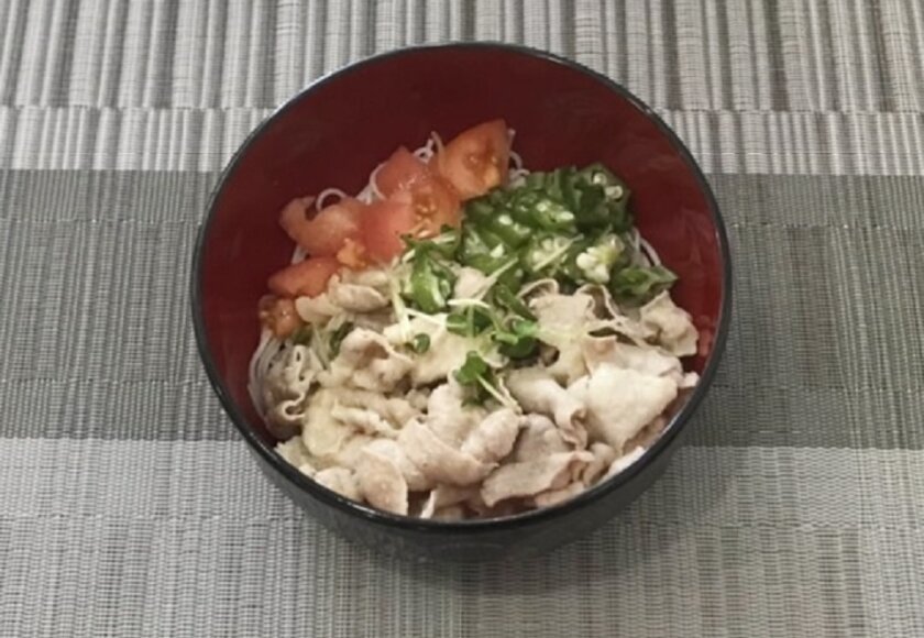 今週はソーメンでのご提供です。豚肉とオクラとトマトをタップリのせて冷たくツルツルと食べて頂きました(嬉)