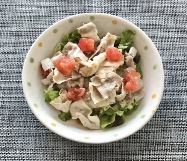 小鉢は、キャベツとエノキの和え物 にんじんと青菜の味噌汁 白桃ゼリー