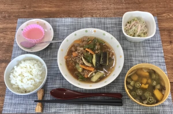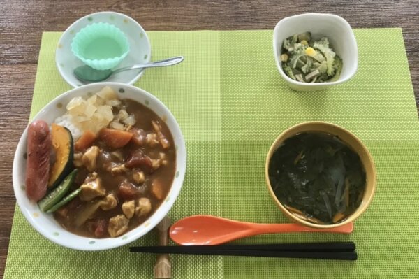 野菜たっぷりの国民食の登場です。ベースはチキンカレーで夏野菜&あらびきウインナーをトッピングです。
