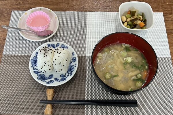オクラが入っておりますが、これは珍しいと思います。ご飯は、ごま塩おにぎり 小鉢は、がめ煮 アップルゼリー