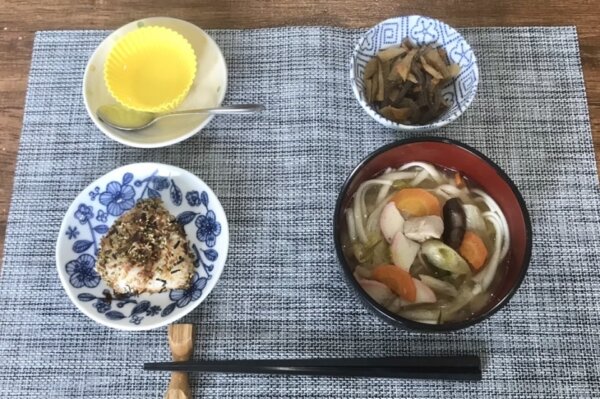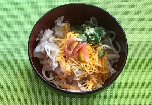 冷やしではのご提供は今年度は終了です(笑)味噌味ですが減塩での味付けにしております。具材は、鶏肉・人参・きのこ