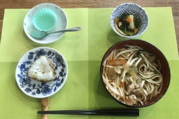 うどんの麺は平打ち麺を使いました。おにぎりは大口の新米を本日よりご提供です。パインゼリー