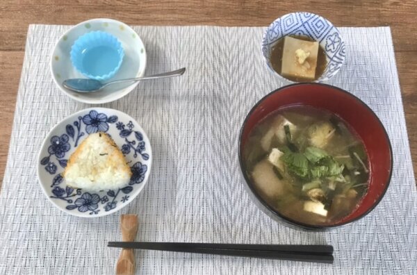 小鉢は2品!ひじきの和えと奄美大島名物「油ソーメン」白菜とネギの味噌汁 マスカットゼリー