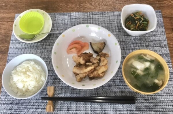 添え物は茄子の素揚げとスター俱楽部で収穫したトマト ワカメとキノコの味噌汁 マスカットゼリー