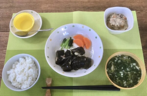 魚は、骨なしの鯖を使っています。小鉢は、うの花 大根葉とキノコの味噌汁 マスカットゼリー