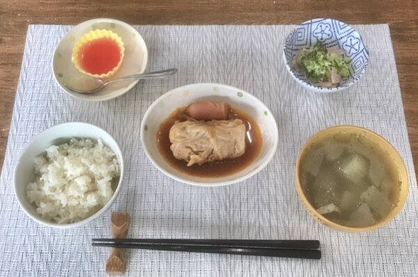 ロールキャベツは市販品ではありません!!朝早くから調理師が丹精込めてキャベツで巻きました。冬瓜のスープも美味しかったですよ。
