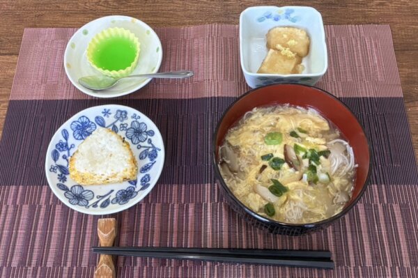 あんの味付けもあっさりと薄味でのご提供。ご飯は、のりたまのオニギリ 小鉢は、揚げ出し豆腐 メロンゼリー