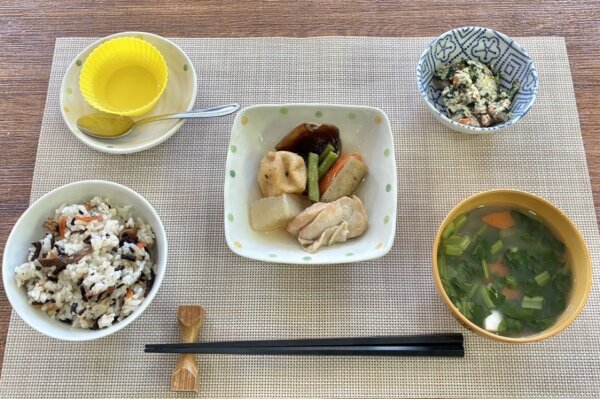 小鉢は、湯の花 大根と厚揚げとにんじんの具沢山味噌汁 アップルゼリー