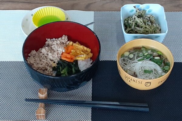 ミンチをたっぷりのせた丼ぶりでした。卵の高騰で少々卵が少なかったかも?です。