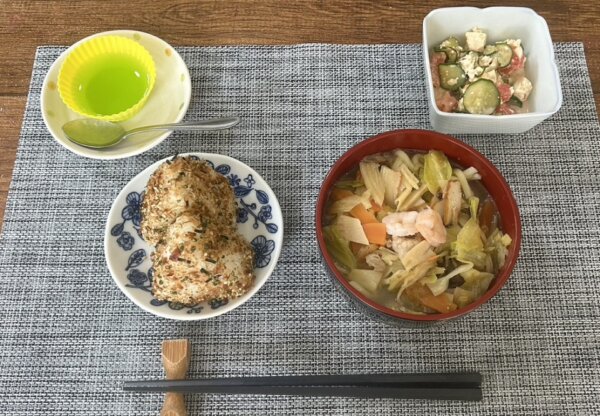 海老・いか・キャベツ・ニンジン・タケノコ・さつま揚げ等々具沢山で栄養満点 小鉢は、豆腐と胡瓜の和え物