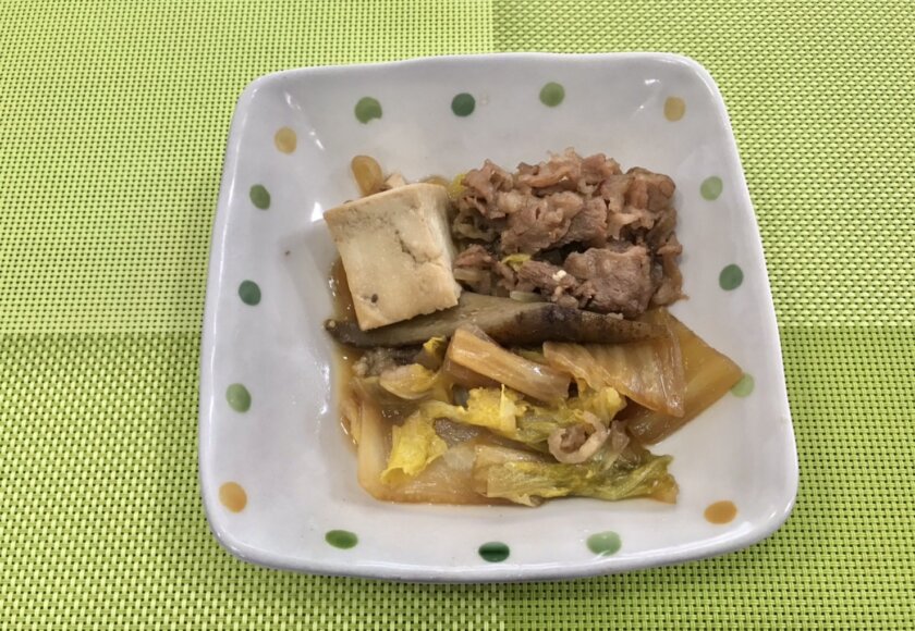 寒い時期は、鍋物系やスープ系が多くなりますよね⁉ 豆腐・糸コン・肉団子・白菜 小鉢はきんぴらごぼう 白桃ゼリー