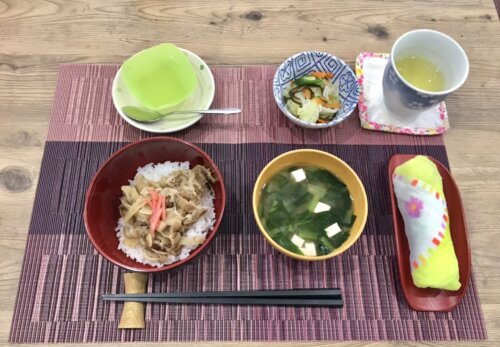 丼はシンプルですが、食べやすいので食事がすすみますよね⁉ 小鉢はひじき煮 豆腐の味噌汁 グレープゼリー