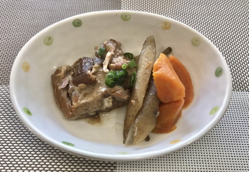今週の和食は筑前煮でした。デイサービスでは良くメニューに出る定番ですね⁉ 小松菜のお浸し アップルゼリー