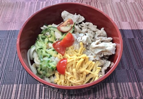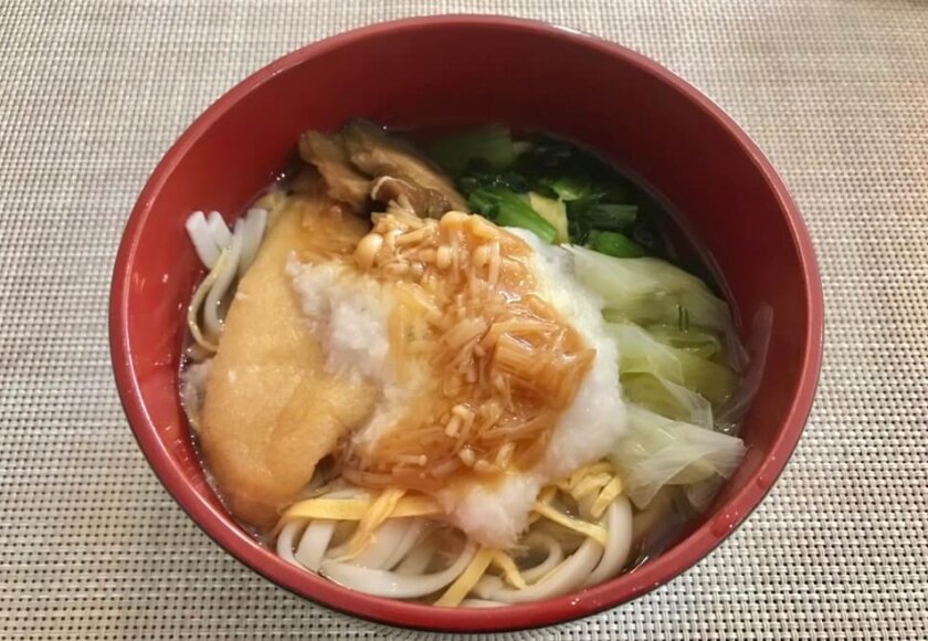 本来はきつねうどんだったのですが、冷蔵庫を整理して余った食材を足しました(笑)